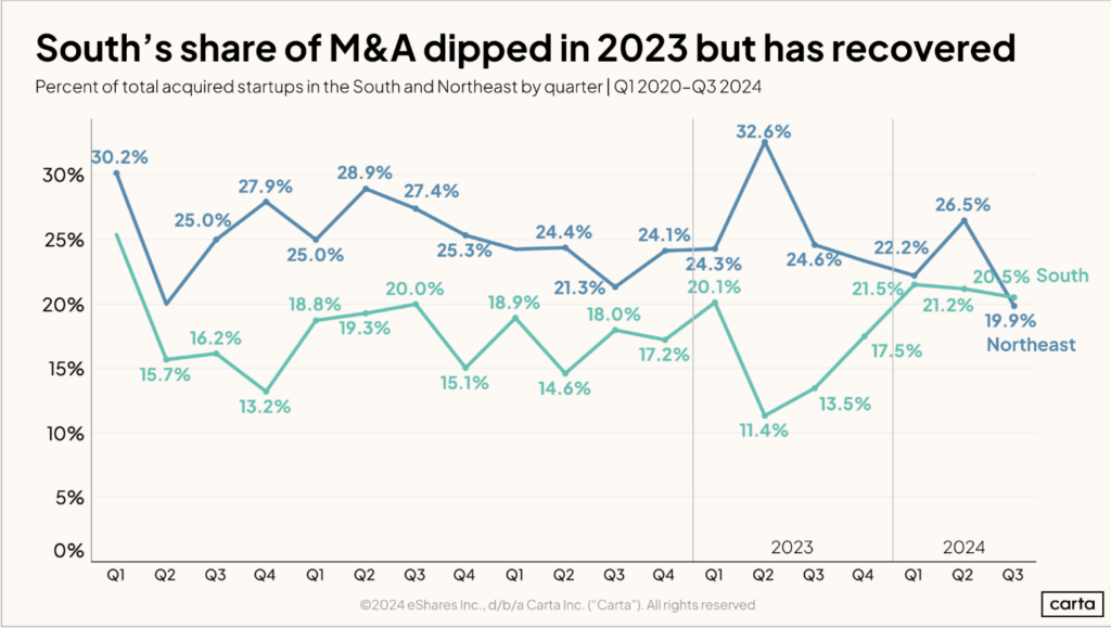 Peter Walker, head of insights at Carta, delivered a data-rich presentation at Valor's VC DAY, offering a founder-centric view of the venture capital landscape, with a particular focus on Southern seed stage venture capital. The insights gleaned from Carta's vast dataset, encompassing 45,000 active U.S. cap tables and 3,000 venture funds, painted a picture of a resilient ecosystem in the South. About 24% of Carta's data is based in the South to date, making this data set particularly rich for our region. It was a pleasure having him present at Valor's private conference, VC DAY , for Valor LPs and founders. Walker's data revealed several positive trends for the South's venture capital ecosystem. Notably, the South is approaching the Northeast in terms of the share of venture capital rounds, and has surpassed it in M&A activity. "Venture companies can be built in the South, venture companies can be exited in the South," Walker emphasized.