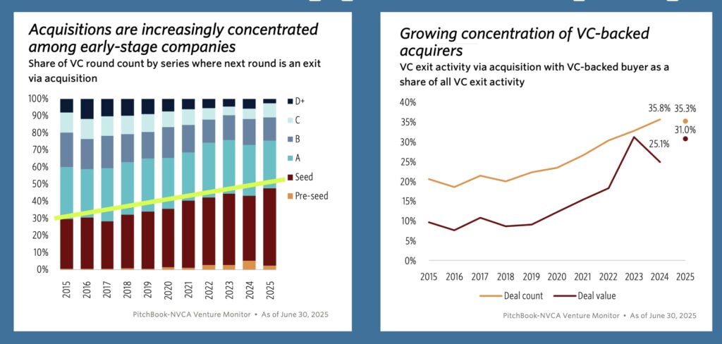 I think the option for startup founders today is the newer one. It’s focused, and in today’s market, more rewarding financially for the founding team, not to mention early investors like Valor. Right now, and for the foreseeable couple of years, corporates and VC-backed platform companies with valuations too massive to IPO today are in an arms race to acquire AI capabilities. (Interestingly, you’ll also see confirmation of this in how much corporate venture has pulled back on investing–they’ve moved into full on corporate development.)In H1 2025, most venture-backed acquisitions cleared $100 million.